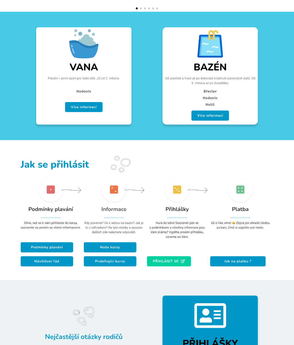 Každá maminka, která hledá to pravé plavání pro své dítě, dá přednost webovkám, které jí nabídnou kvalitní služby přehledně prezentované přímo pro její potřeby. Dopřejte jim možnost jednoduchého přihlášení na lekce a všechny důležité informace lehce dohledatelné na webu.